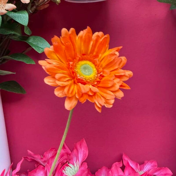 Deze oranje kunstbloem gerbera is dé keuze voor wie houdt van kleur, kracht en karakter in huis – het hele jaar door.