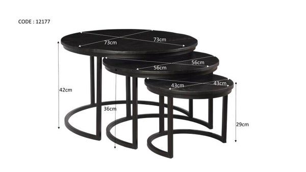 Dankzij de verschillende afmetingen kun je de tafels speels over elkaar schuiven, naast elkaar plaatsen of los van elkaar gebruiken. De ronde bladen zijn afgewerkt met een duurzame zwarte coating die het natuurlijke karakter van het mangohout benadrukt en tegelijkertijd bescherming biedt tegen dagelijks gebruik. Perfect voor wie op zoek is naar een moderne salontafelset die zowel functioneel als verfijnd is.