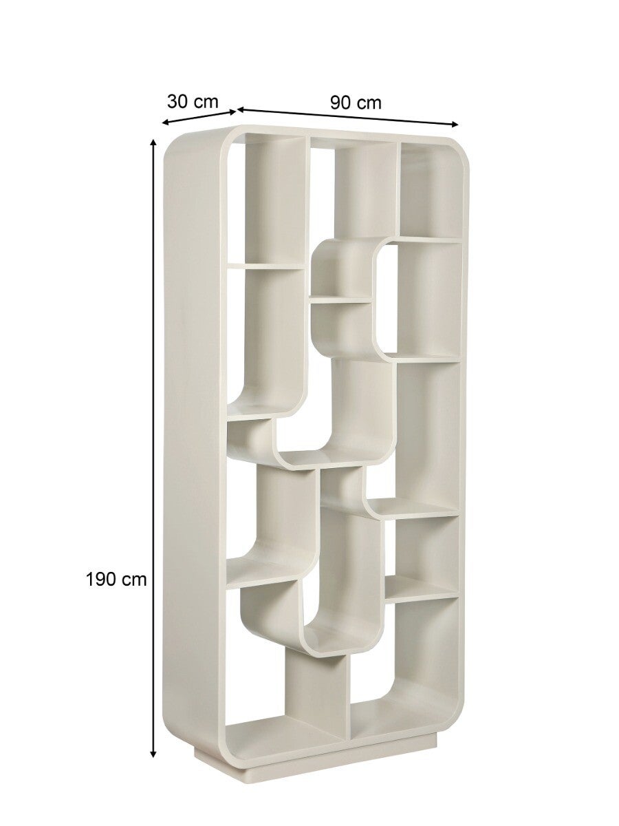 Met zijn unieke asymmetrische ontwerp biedt deze boekenkast niet alleen ruimte voor boeken, maar ook voor woonaccessoires, planten of kunstobjecten. Dankzij de neutrale tint vormt de kast een prachtig, ingetogen statement dat past in elk kleurpalet.
