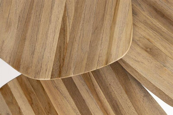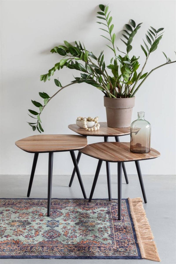 De Salontafel Set van 3 Lily van Chique-Living combineert elegantie met functionaliteit. Deze drie tafels, uitgevoerd in teak fineer met een warmbruine houttint, brengen direct sfeer in je woonkamer. Het slanke zwarte metalen onderstel geeft de set een moderne, industriële uitstraling.
