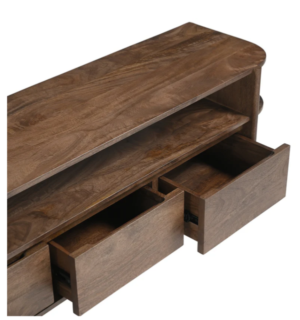 Dit tv-meubel biedt niet alleen een stijlvolle plek voor uw televisie en media-apparatuur, maar ook volop opbergruimte. Dankzij het open vak, de zijplanken en drie ruime lades kunt u eenvoudig al uw accessoires en elektronica georganiseerd opbergen. Zo combineert de Jade tv-kast praktisch gemak met verfijnd design.