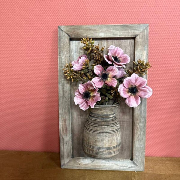 Houten Schilderij Met Pot Inclusief Zijden Bloemen ‘Anemoon’
