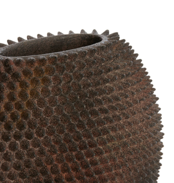De spikestructuur geeft deze bruine ovale vaas een speels reliëf en een luxe uitstraling. De matte, warme afwerking maakt de vaas krachtig zonder te overheersen.