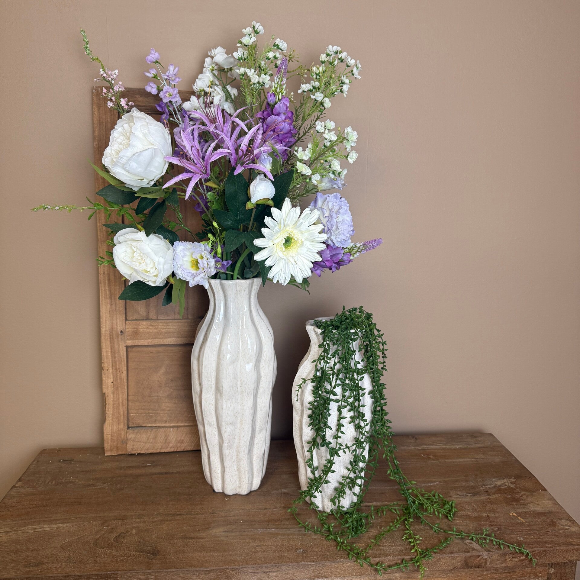 2 Vazen Inclusief Kunst Boeket & Plantje